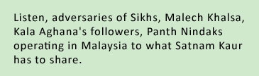 Listen, adversaries of Sikhs, Malech Khalsa, Kala Aghana’s followers, Panth Nindaks operating in Malaysia to what Satnam Kaur has to share.